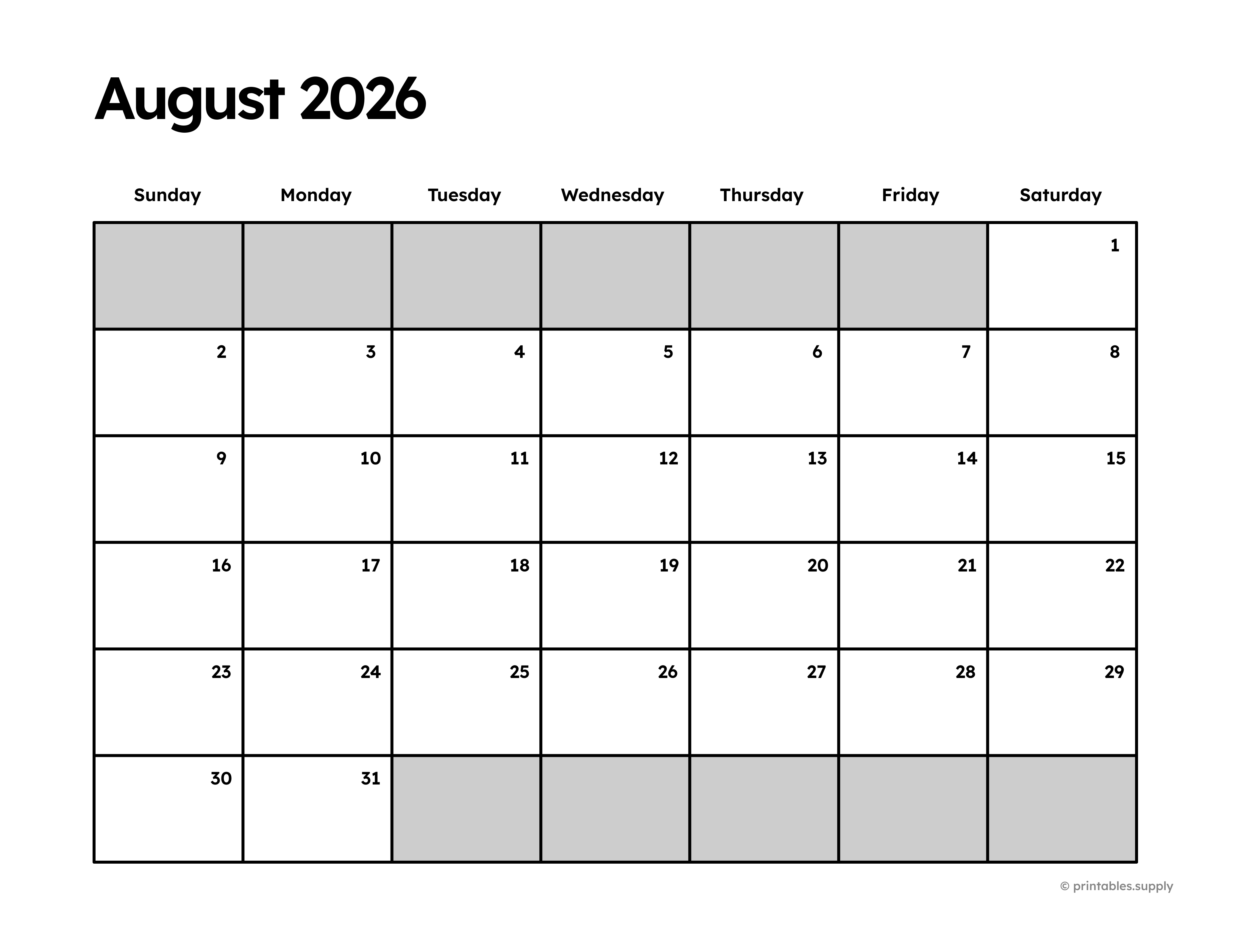 A printable August 2026 calendar with a clean monthly layout for classroom planning, homeschool routines, family schedules, and habit tracking.