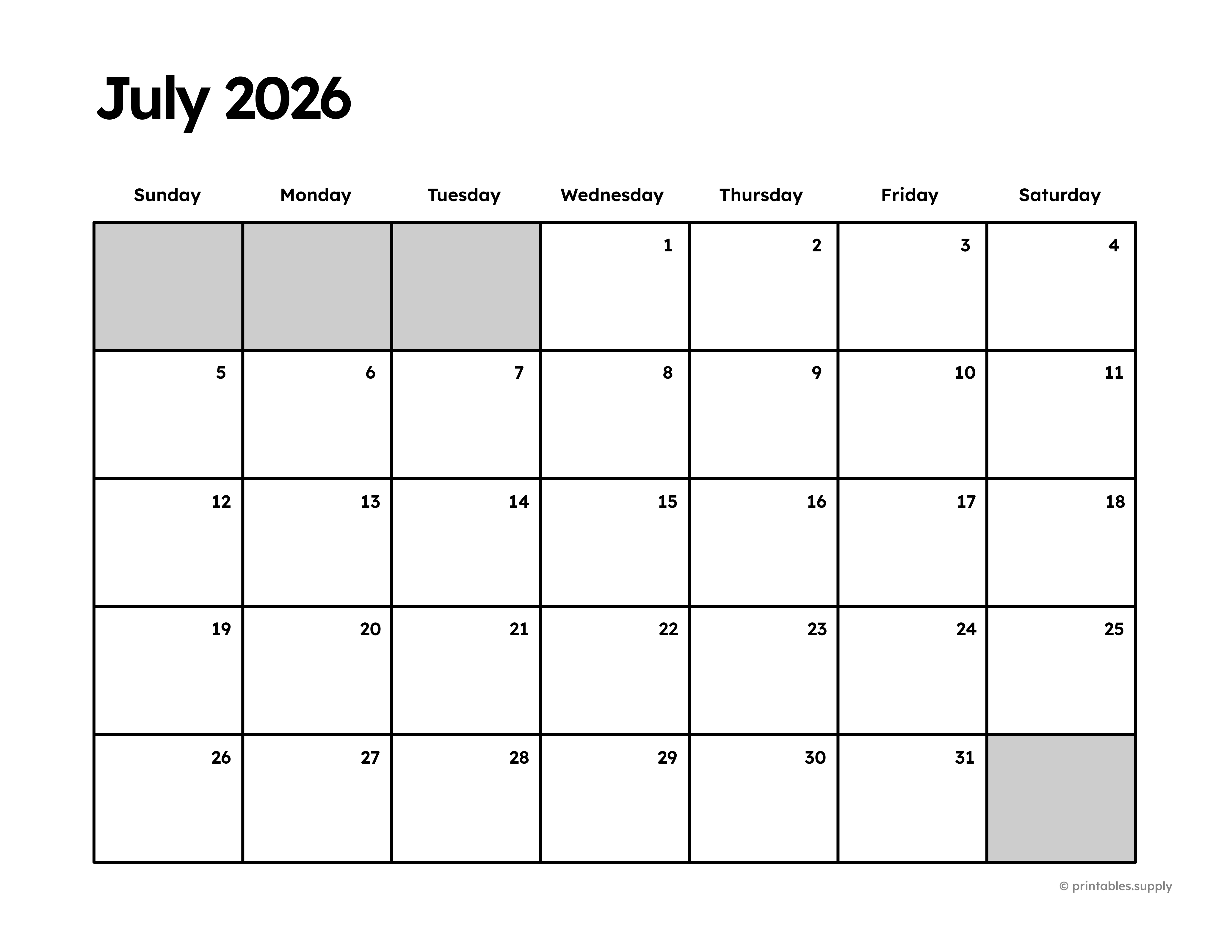 A printable July 2026 calendar with a clean monthly layout for classroom planning, homeschool routines, family schedules, and habit tracking.