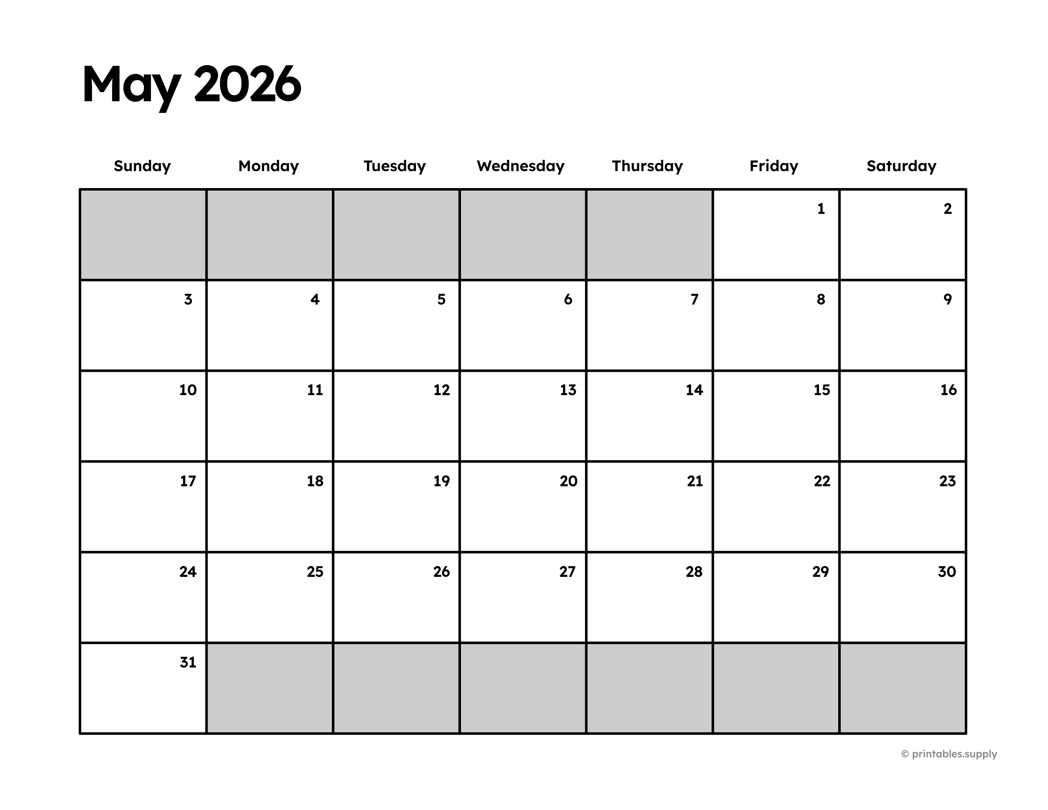 A printable May 2026 calendar with a clean monthly layout for classroom planning, homeschool routines, family schedules, and habit tracking.