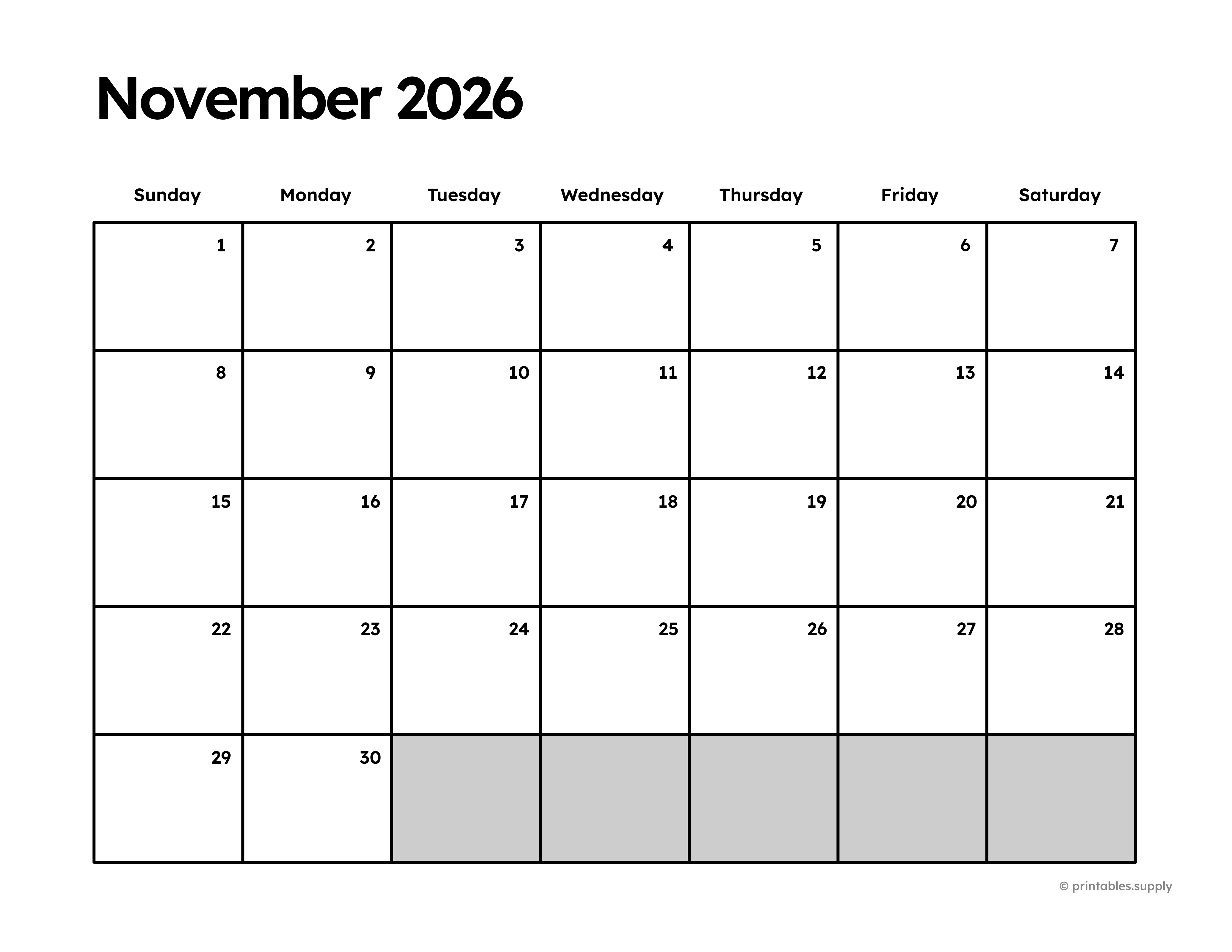 A printable November 2026 calendar with a clean monthly layout for classroom planning, homeschool routines, family schedules, and habit tracking.