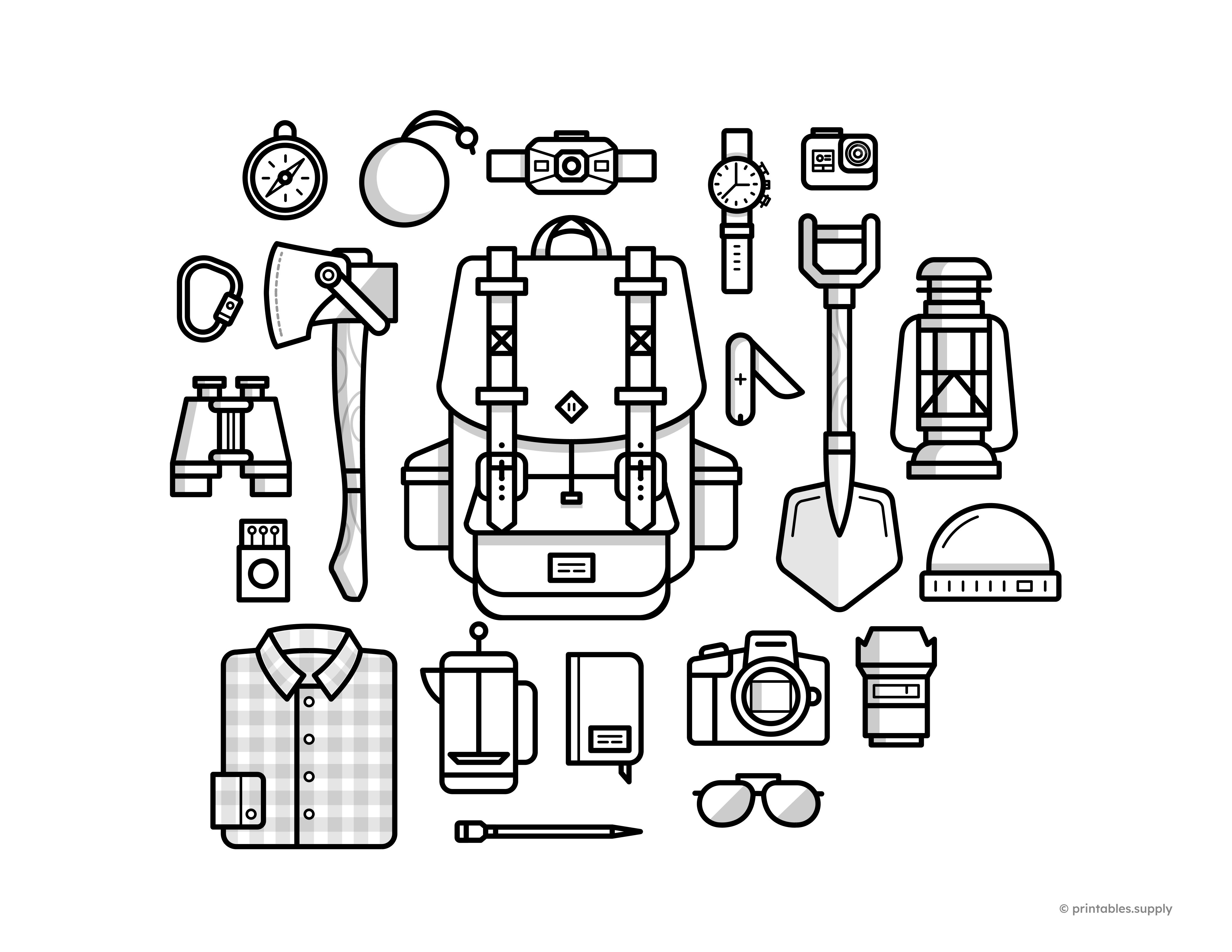 This camping supplies printable features outdoor gear and adventure-themed elements for coloring, ideal for nature units, camping-themed activities, summer learning, and creative play that sparks imagination about outdoor exploration.